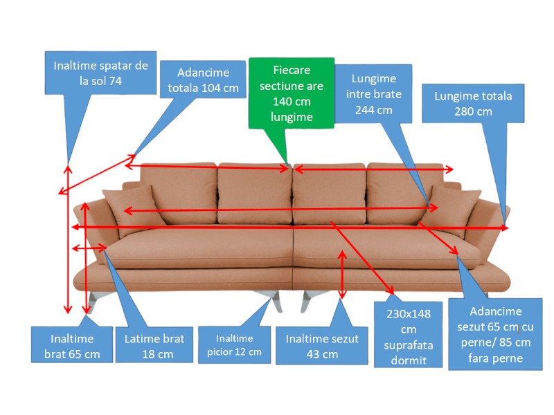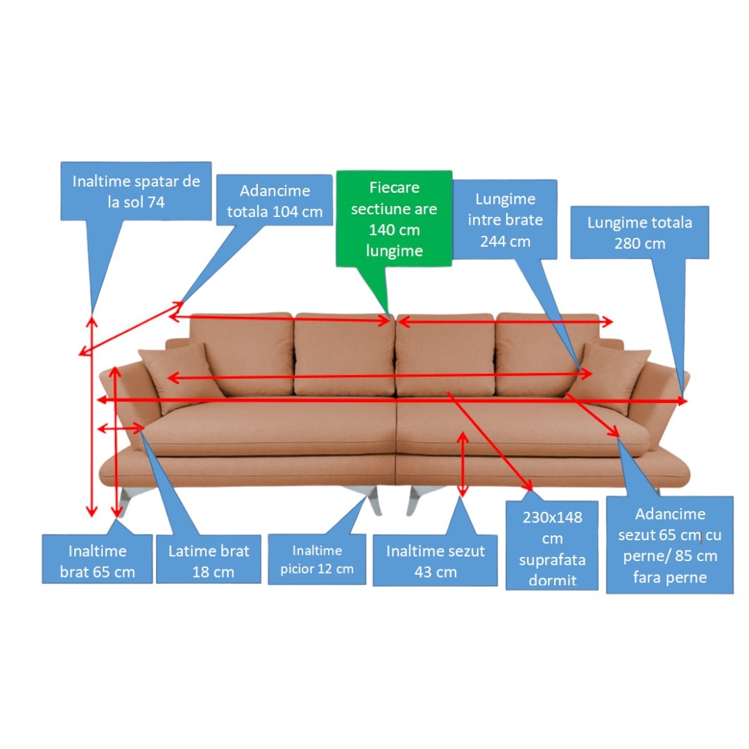 Acest model de canapea poate fi personalizata în funcție de dimensiunile dorite (în limita posibilităților tehnice).