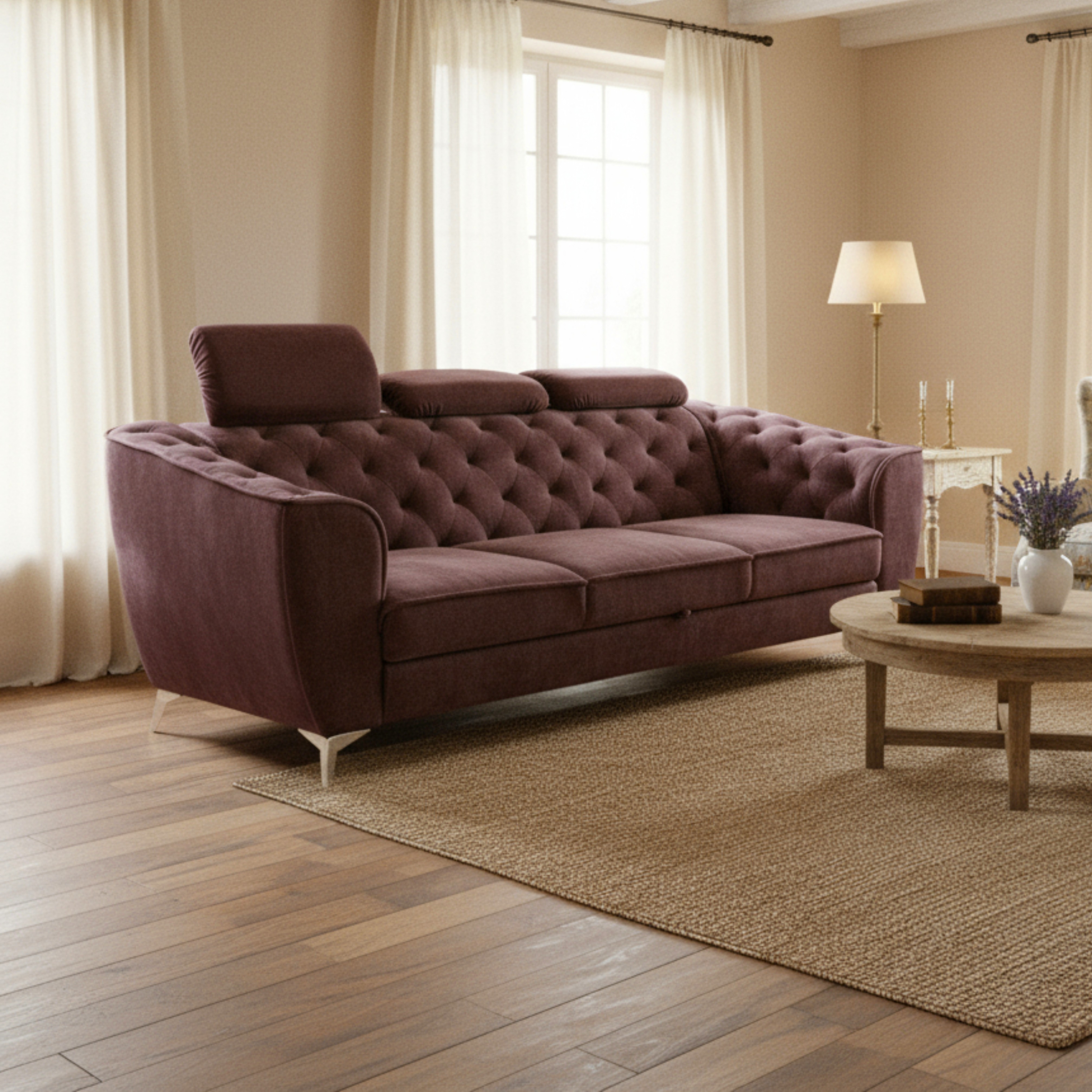 Canapeaua are un design versatil, care poate să se potrivească atât într-un ambient tradițional, cât și într-unul modern. Este prevăzută cu o funcție extensibilă pentru a oferi spațiu suplimentar pentru dormit. Linia canapelei este aerodinamică, cu detalii clasice precum cusături decorative pe brațe și spătar