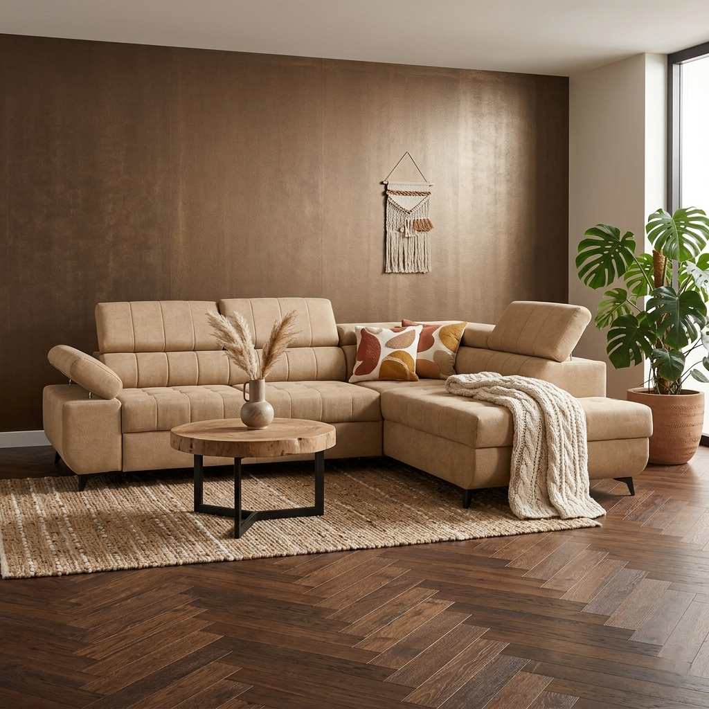 Liniile echilibrate și proporțiile generoase transformă acest colțar într-o piesă centrală a încăperii. Aspectul său elegant îl face potrivit atât pentru interioare moderne, cât și pentru amenajări cu accente sofisticate.