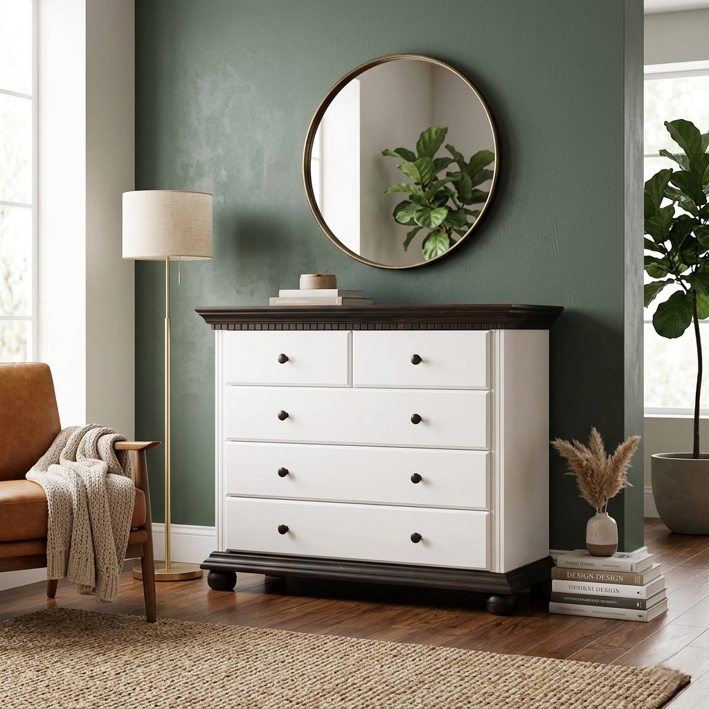 Comoda Bucov cu 5 sertare, în finisaj alb cu nuc, este o piesă de mobilier elegantă și practică, ideală pentru interioare moderne și sofisticate.