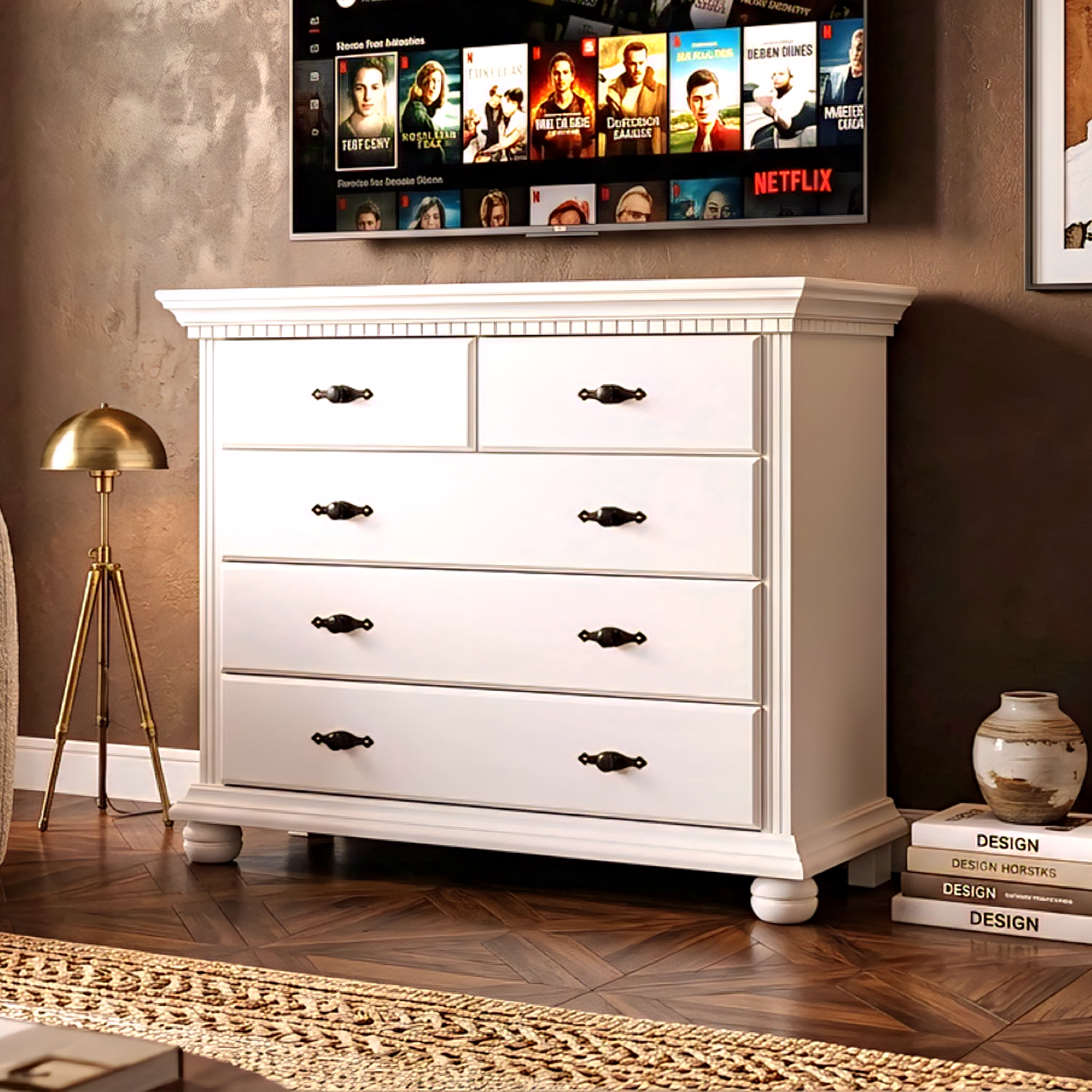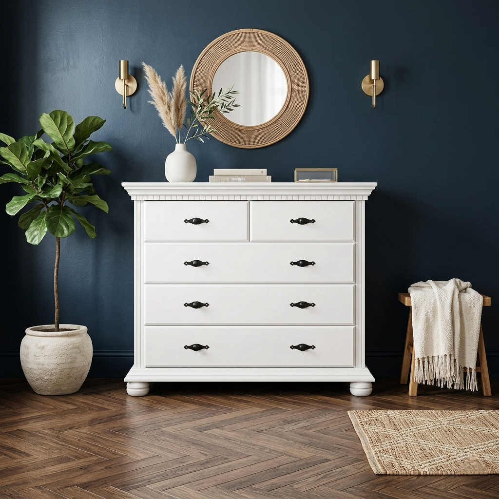 Comoda Bucov cu 5 sertare, realizată din lemn masiv și finisată în alb, este soluția ideală pentru organizarea eficientă a spațiului. Oferă acces rapid și compartimentare practică pentru haine și accesorii.