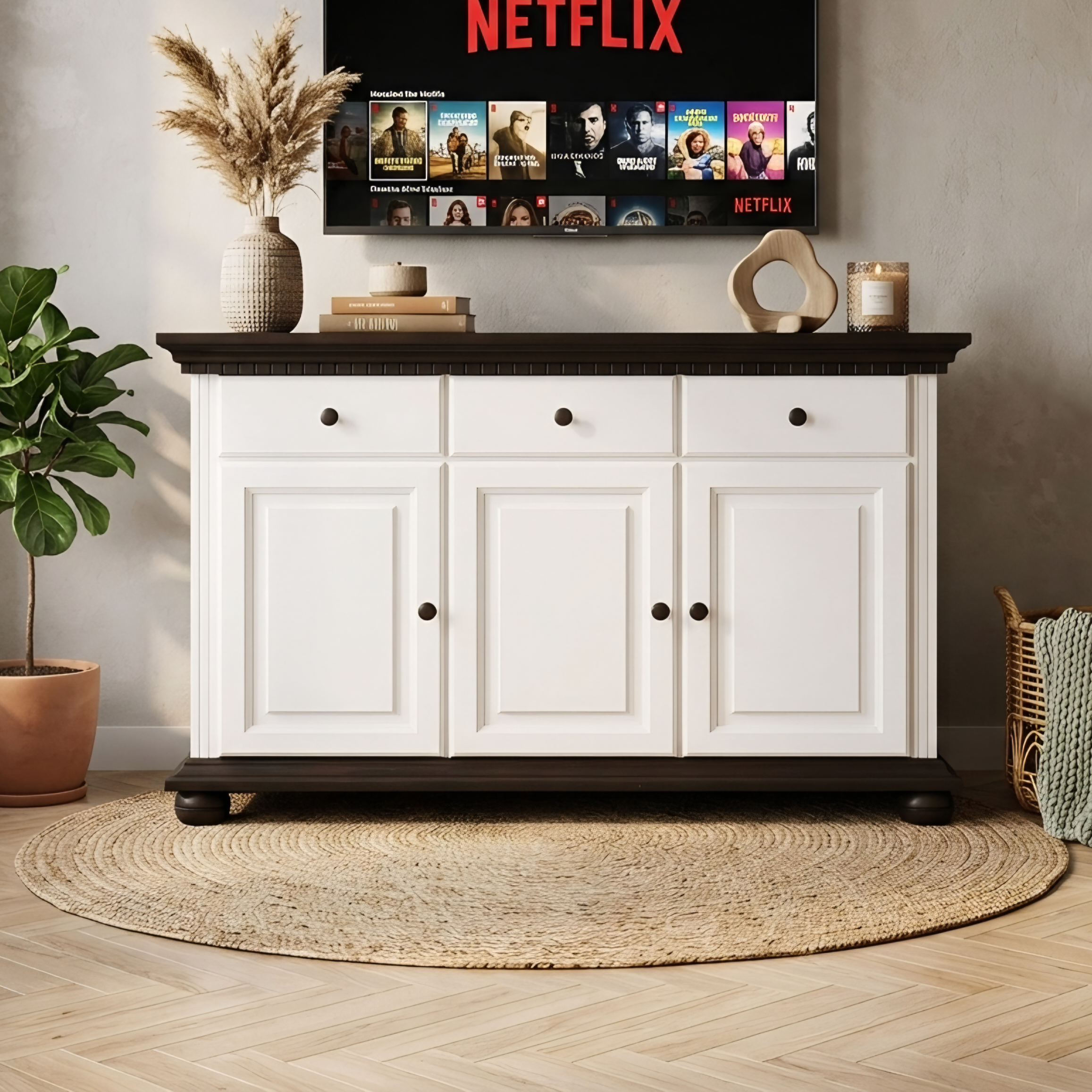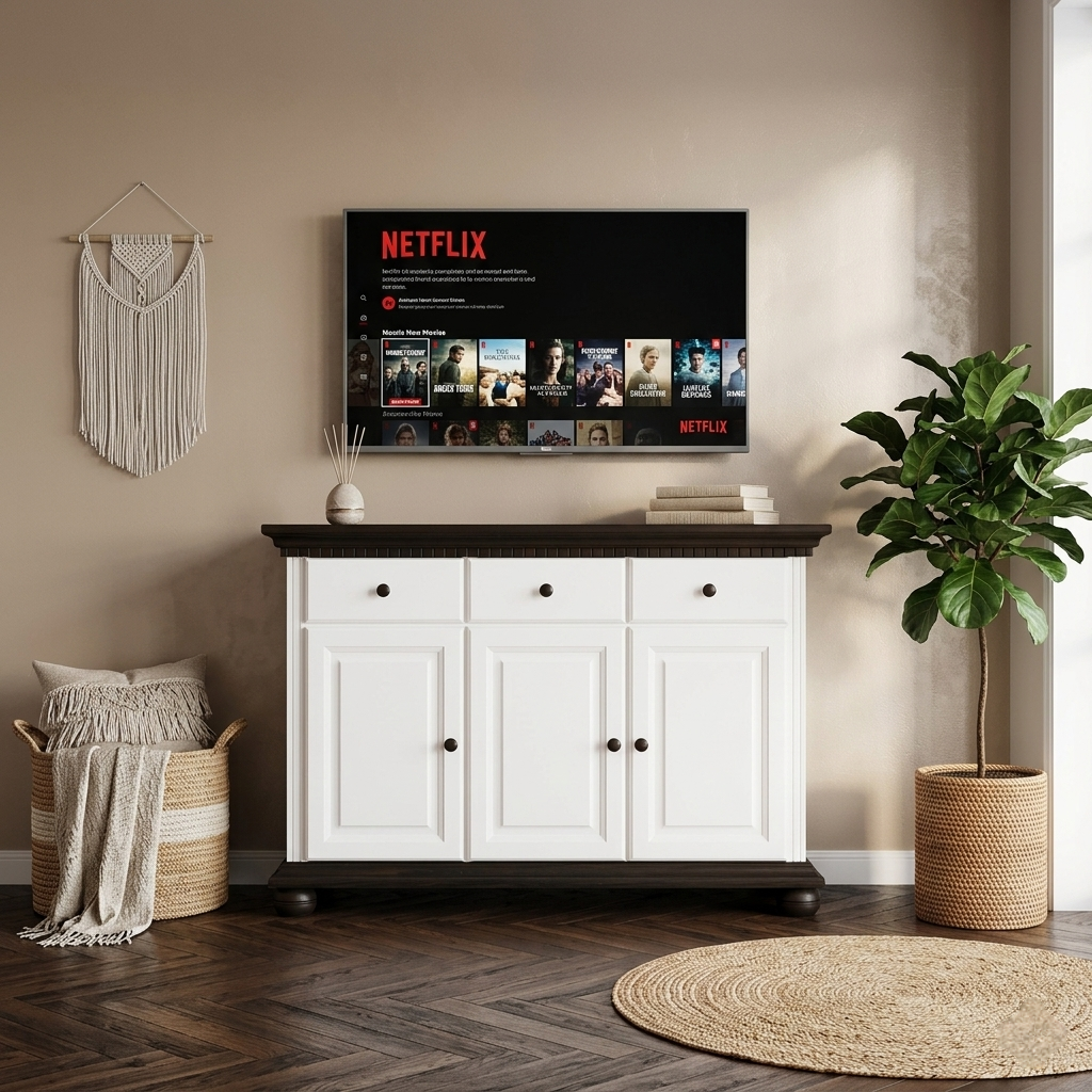 Comoda Bucov alb cu nuc oferă un design elegant și contrast puternic, fiind ideală pentru amenajări moderne și sofisticate. Spațiu generos de depozitare și construcție durabilă.