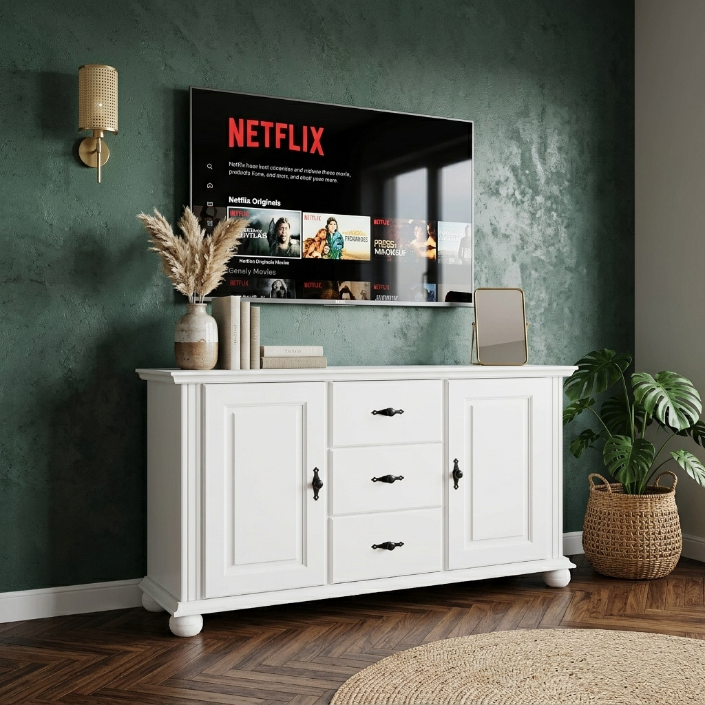 Comoda Seva albă din lemn masiv oferă o combinație ideală între design modern și funcționalitate. Cu 2 uși și 3 sertare, permite organizarea eficientă a obiectelor într-un spațiu compact și elegant.
