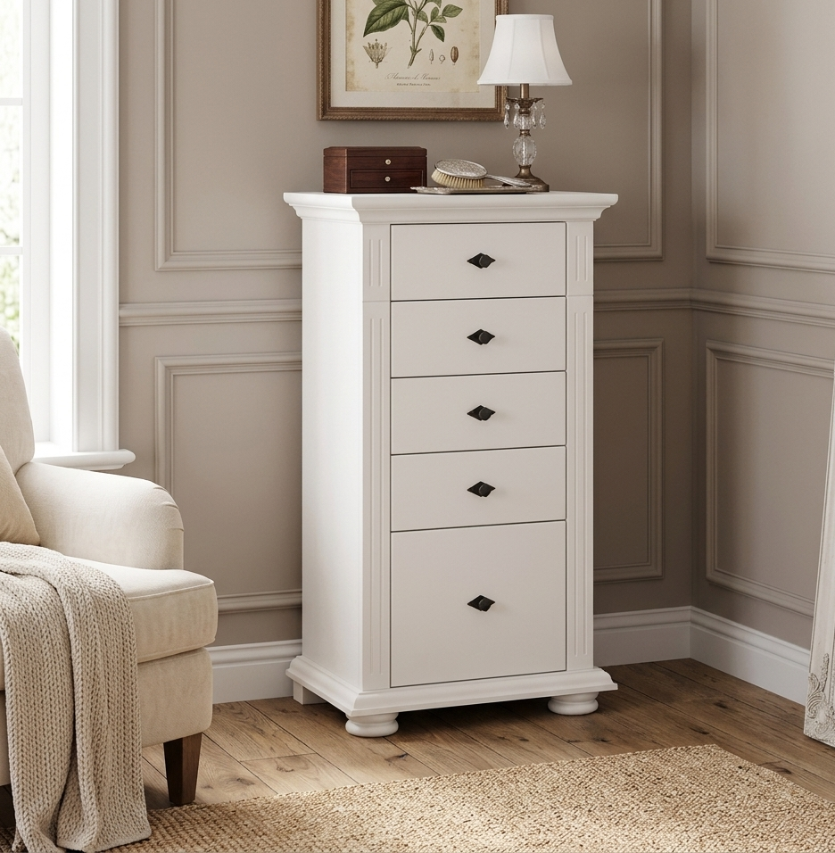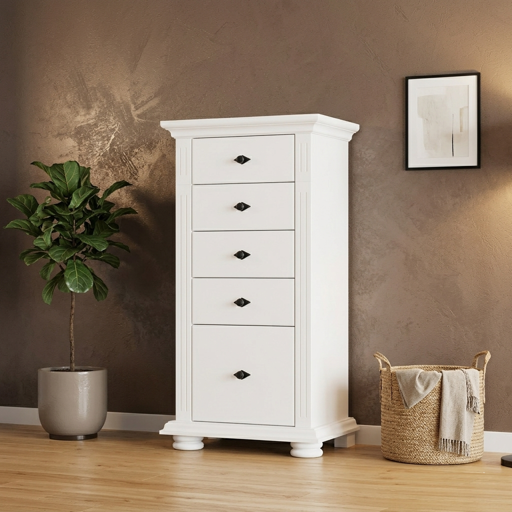 Comoda Vero din lemn masiv alb, cu 5 sertare spațioase, este soluția ideală pentru organizarea eficientă în spații moderne. Designul vertical și aspectul luminos o fac perfectă pentru dormitor, living sau hol.