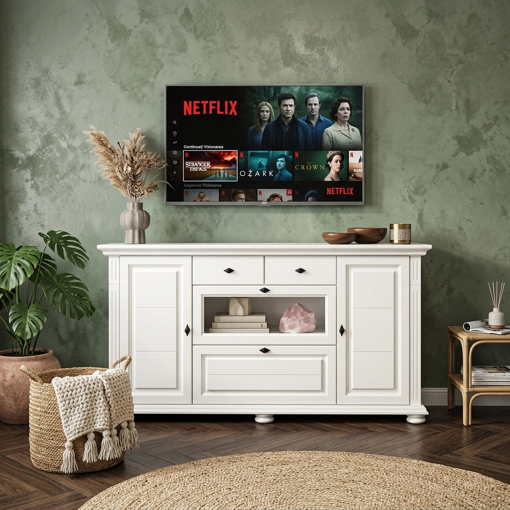 Detaliile decorative, liniile clasice și finisajele atent realizate oferă bufetului un aspect rafinat, potrivit atât pentru interioare moderne, cât și pentru cele clasice.