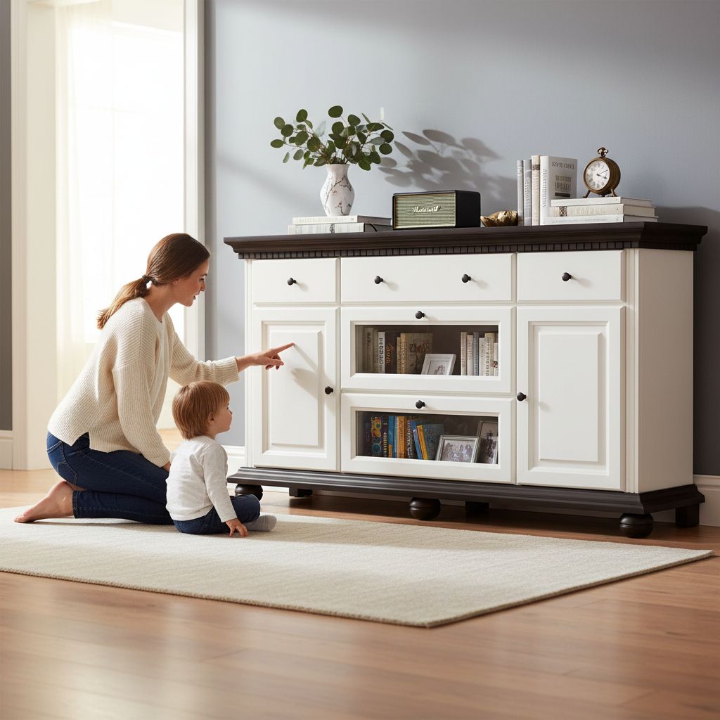 Ofera o compartimentare practica cu usi,usi cu vitrina si sertare , aducand un aspect elegant si luminos livingului dumneavoastra. Este construita integral din lemn masiv, iar manerele pot fi butoni cu placute metalice sau butoni din lemn