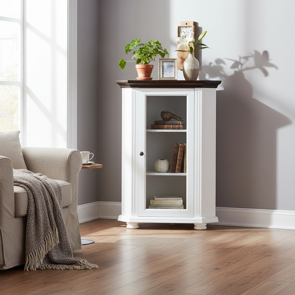 Vitrina de colț Mara este piesa ideală pentru a transforma colțurile în zone de expunere elegante. Construită din lemn masiv premium cu ușă din sticlă transparentă, pune în valoare obiectele tale preferate.