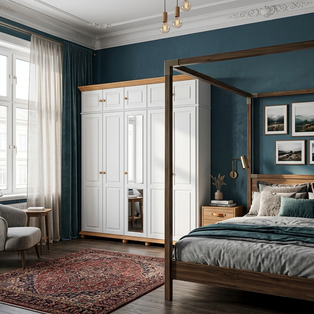Dulap din lemn masiv cu 5 uși clasice și corp suprapozabil inclus. Disponibil în variantele alb cu miere (imagine), alb cu nuc sau alb complet. Piesă centrală din colecția Bucov.