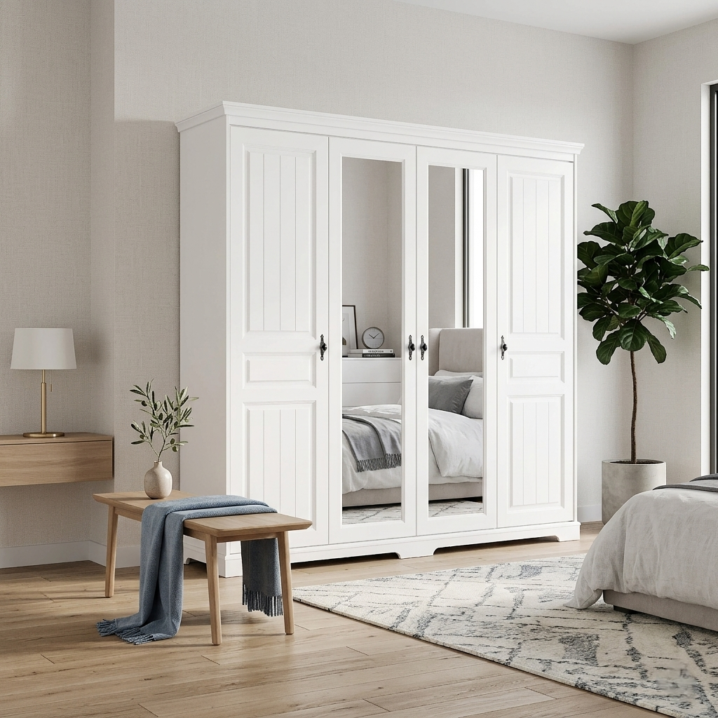 Dulapul Cleo cu 4 uși și oglindă din lemn masiv oferă echilibrul perfect între eleganță și funcționalitate. Ideal pentru dormitoare spațioase și luminoase.