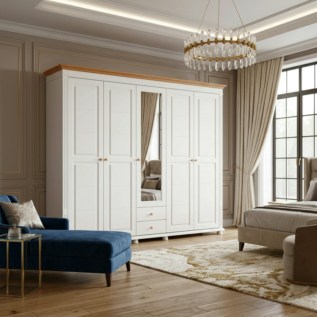 Dulapul Mara este o piesă impunătoare, din lemn masiv, cu 4 uși și 2 sertare spațioase. Oglinzile centrale și finisajul alb clasic îl fac ideal pentru dormitoare elegante și luminoase.