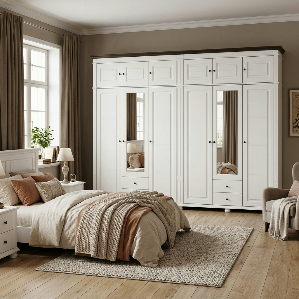 Dulapul MARA cu 6 uși, 4 sertare și suprapozabil oferă spațiu maxim și organizare eficientă pentru întreaga garderobă. Ideal pentru familii și utilizare intensă.