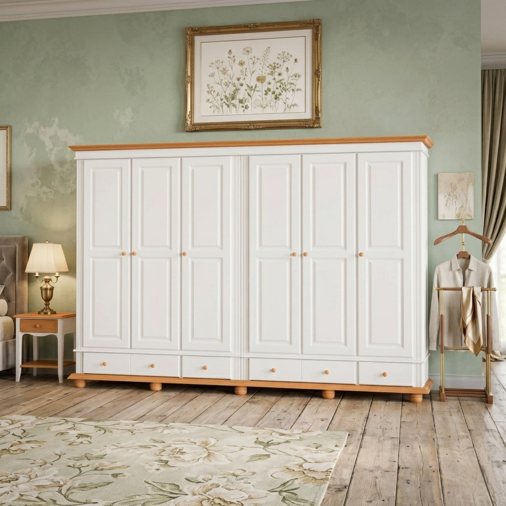 Dulapul SEVA 6 uși pline cu 4 sertare oferă spațiu generos și un aspect curat, uniform. Ideal pentru cei care preferă design simplu și organizare eficientă.