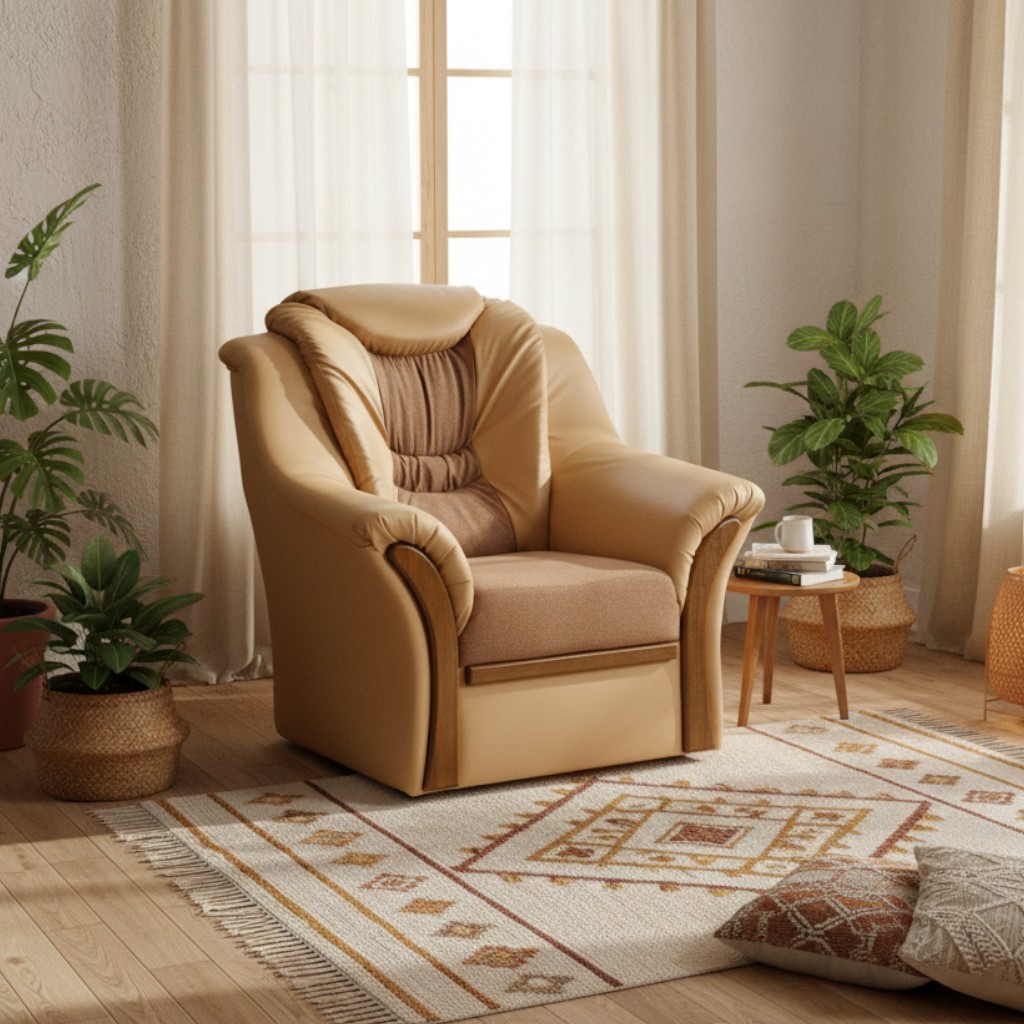 Fotoliul clasic tapitat îmbină perfect tradiția cu confortul modern, oferind un șezut generos și un spătar ergonomic pentru susținere optimă. Picioarele elegante din lemn completează designul, adăugând stabilitate și durabilitate pe termen lung.