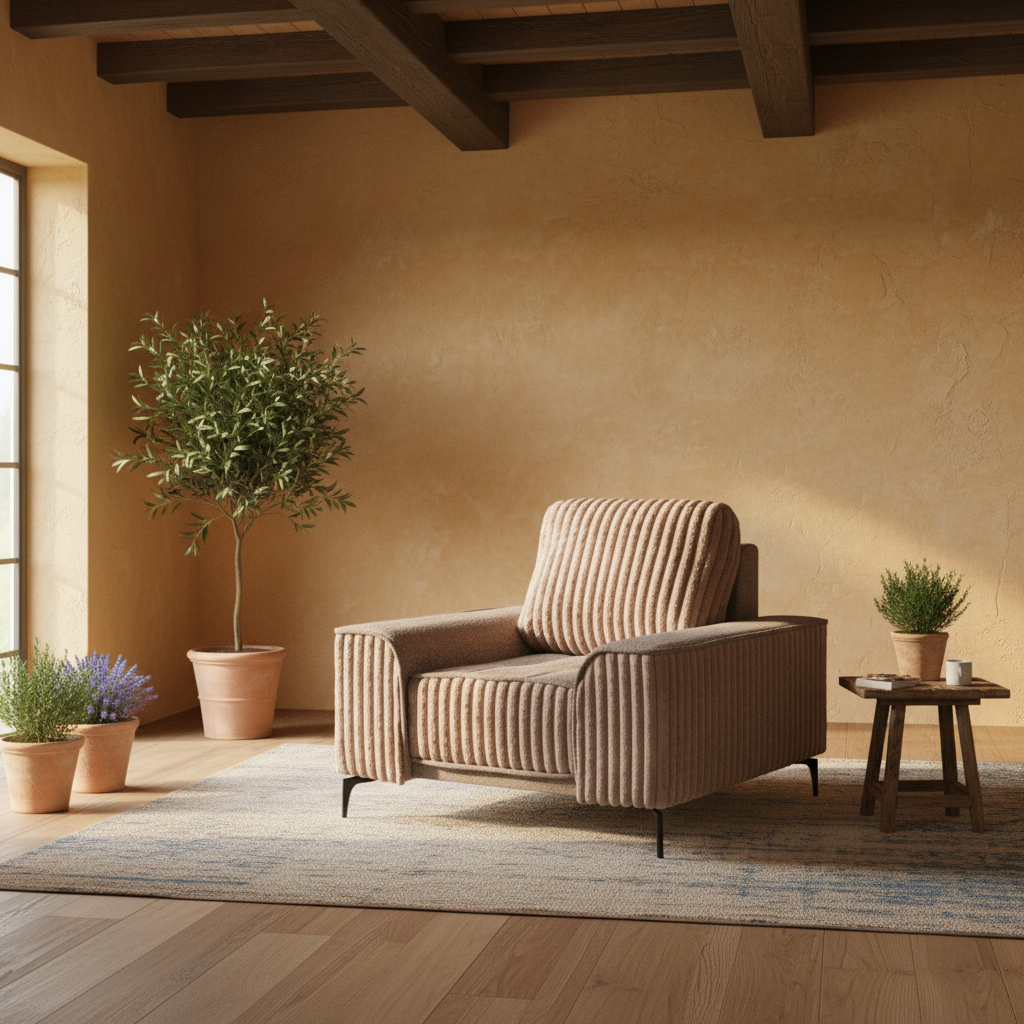 Fotoliul BARON este o piesă de mobilier modernă, cu un design robust și primitor, creată pentru relaxare zilnică și confort de durată. Forma amplă, proporțiile bine echilibrate și liniile verticale ale tapițeriei conferă fotoliului un aspect elegant, ușor de integrat în livinguri contemporane sau spații de tip lounge.