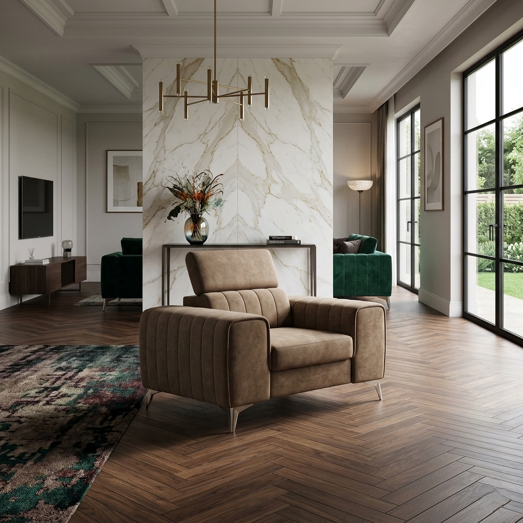 Fotoliul modern CLEMENT este proiectat pentru confort zilnic și funcționalitate. Modelul dispune de tetiera reglabila, șezut cu arcuri sinusoidale și spumă poliuretanică, precum și de picioare metalice inalte. Structura solidă din lemn de fag și picioarele metalice oferă stabilitate și durabilitate pe termen lung.