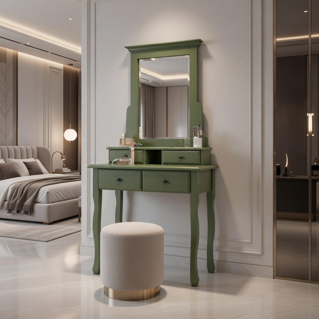 Masa de machiaj MARA este realizată din lemn masiv și finisată în nuanța modernă Verde Olive RAL 6003, o culoare naturală și sofisticată, potrivită pentru dormitoare elegante sau spații de tip dressing.