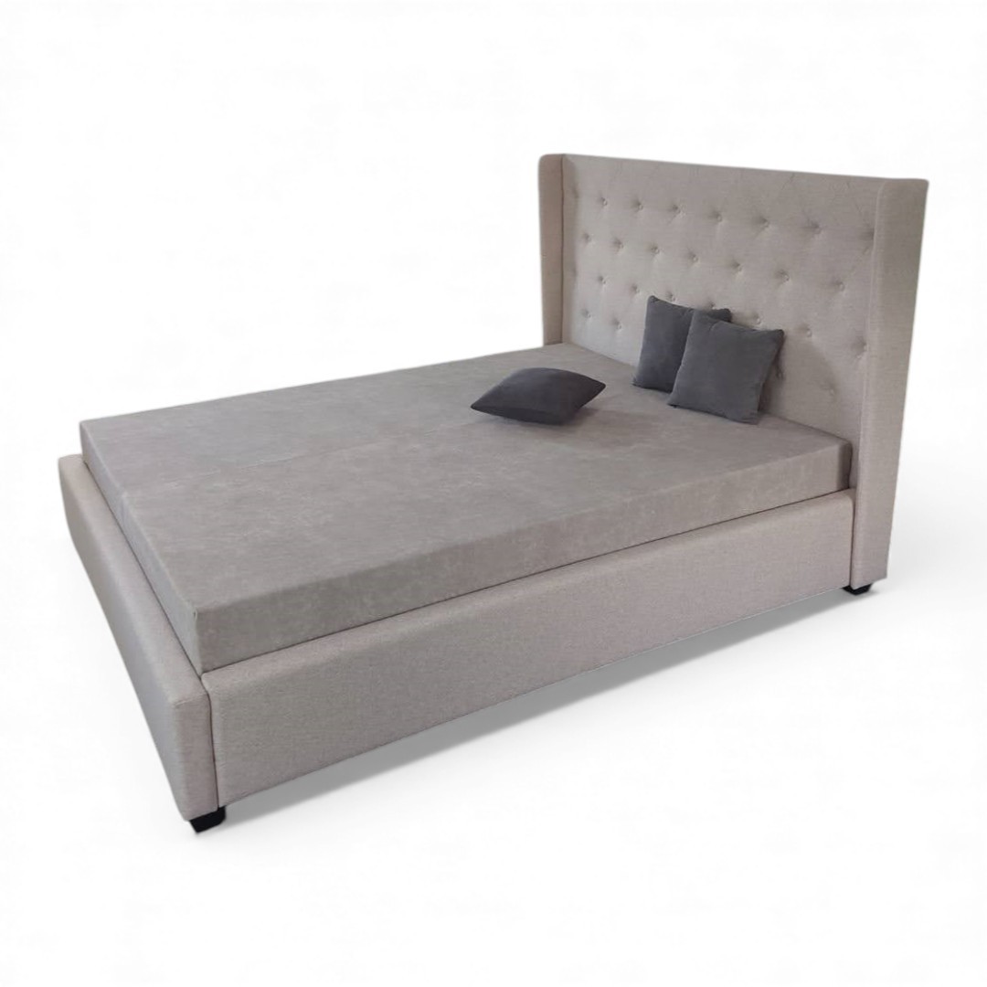 Tăblia înaltă, capitonată cu nasturi, adaugă o notă sofisticată și un plus de confort, fiind un punct focal în orice dormitor. În funcție de nevoile tale, suportul pentru saltea poate fi ales din variantele disponibile: PAL, somieră metalică fixă sau somieră metalică rabatabilă, ideală pentru accesul la spațiul de depozitare generos integrat.