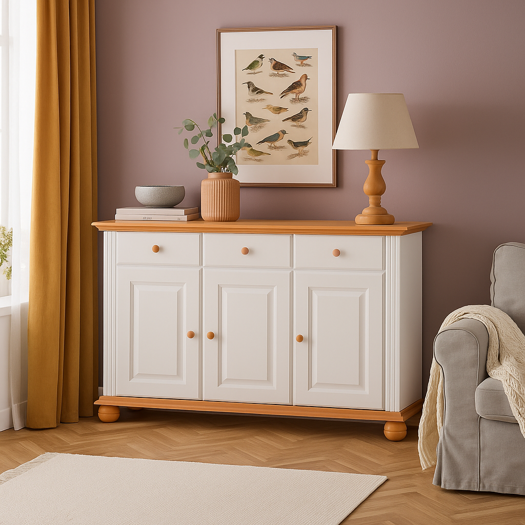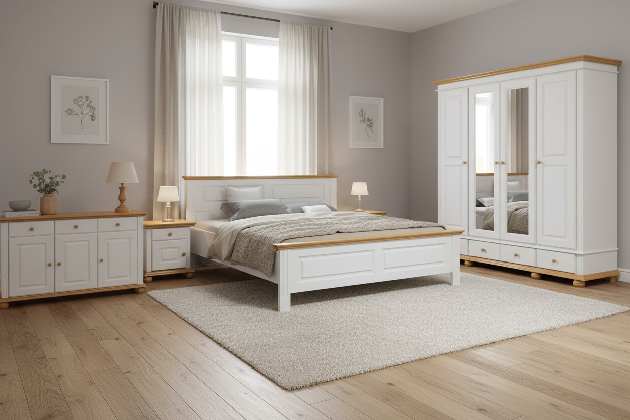 Descoperă mobila de dormitor din lemn masiv Seva, disponibilă în variante elegante de alb cu natur, alb cu nuc sau alb simplu. Acest dormitor multifuncțional și adaptabil completează perfect orice spațiu, oferind un design contemporan de tranziție între stilul clasic și minimalist.