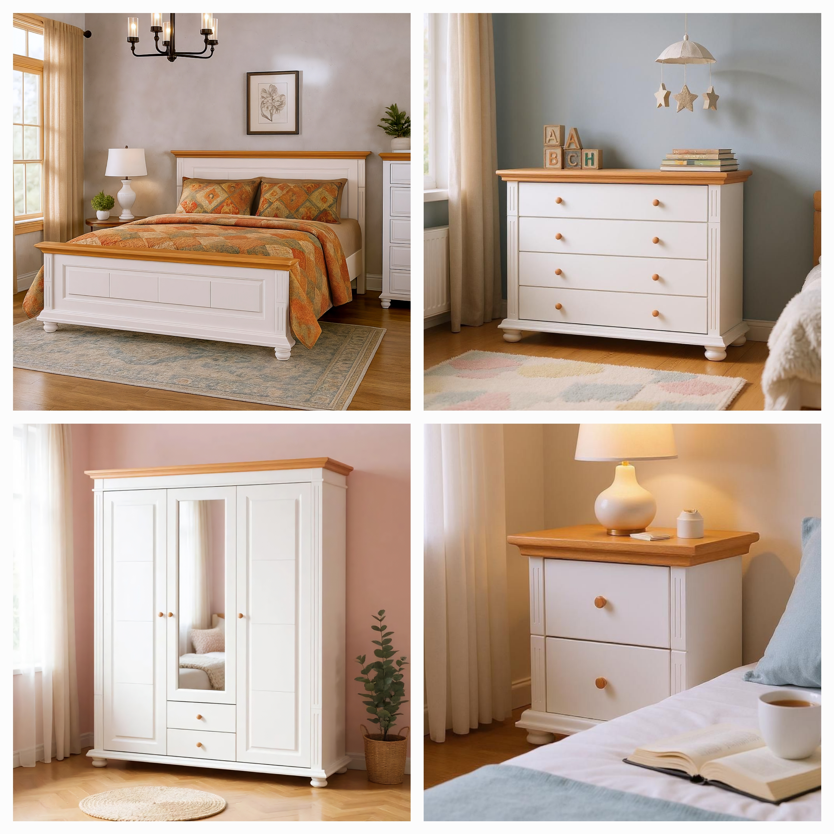 Descoperă eleganța atemporală a dormitorului din lemn masiv finistat in nuante de alb integral, alb cu natur sau alb cu nuc, unde designul rafinat și calitatea superioară se îmbină perfect pentru un mobilier durabil, versatil și sofisticat. Acest set de dormitor creează o atmosferă caldă și reconfortantă, adăugând un plus de stil oricărei camere.