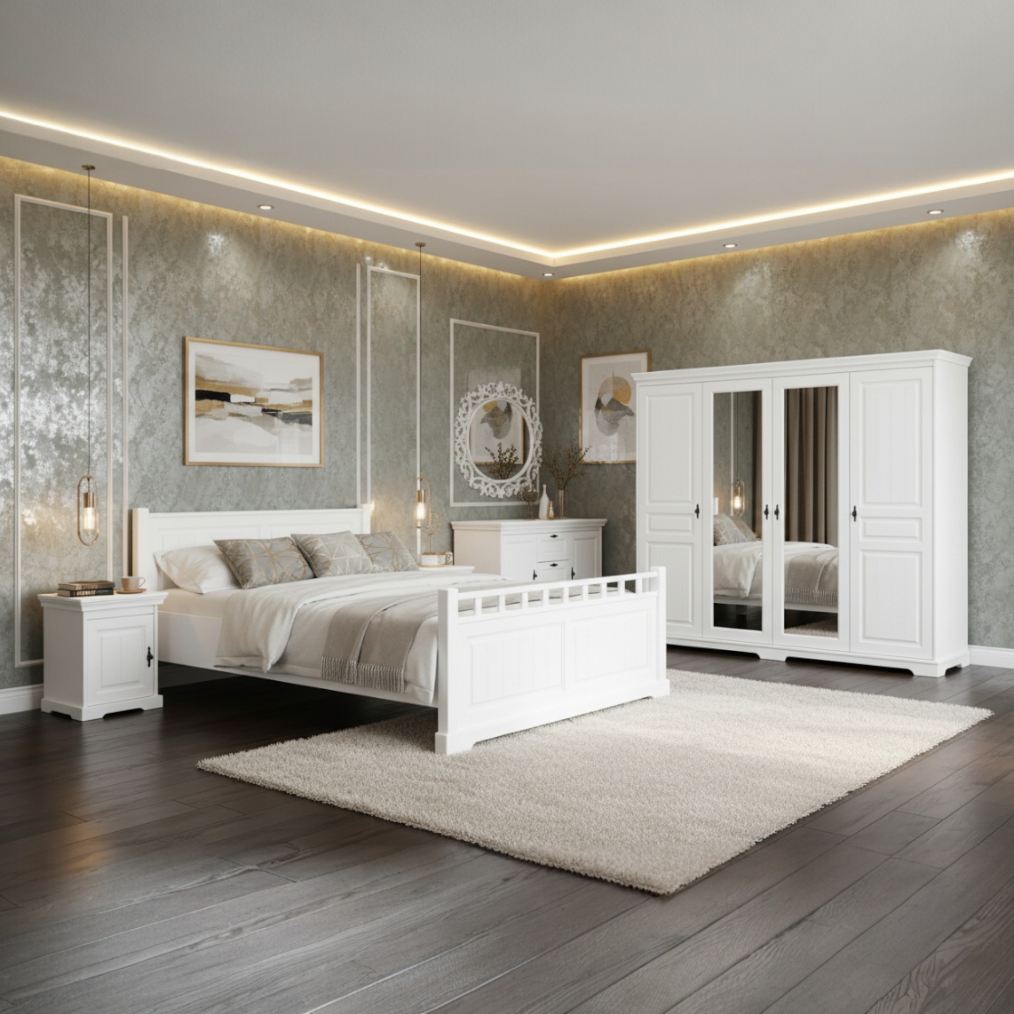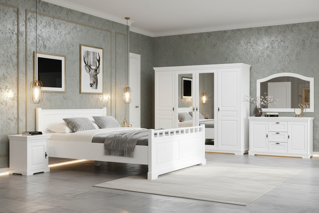 Alege Dormitorul clasic CLEO, o expresie a luxului atemporal și a manoperei de înaltă precizie. Conceput integral din lemn masiv, finisat într-un alb clasic și luminos, acest set reprezintă o investiție durabilă în confortul și stilul casei tale.