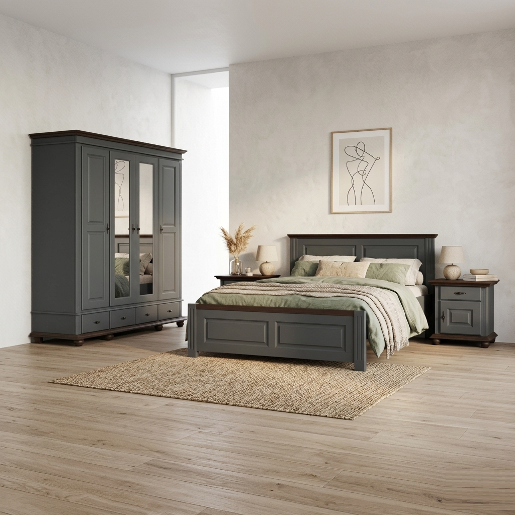 Dormitor complet SEVA 3 din lemn masiv în nuanța modernă Gri Urban. Setul include pat matrimonial, dulap generos cu 4 uși (două cu oglindă) și două noptiere asortate. Eleganță clasică cu accent contemporan, perfect pentru dormitoare actuale.