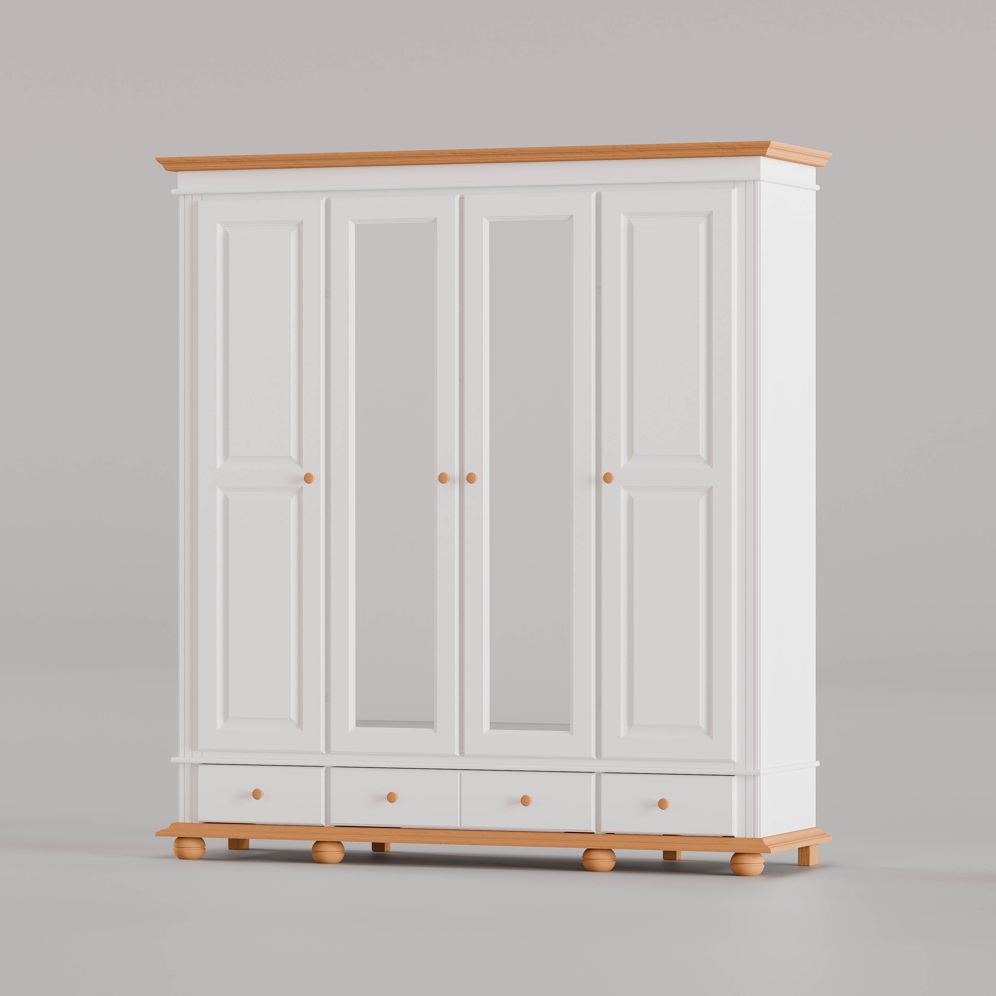 Dulap SEVA 4 uși cu oglindă Dulap spațios cu 4 uși (2 uși cu oglindă integrală + 2 uși pline), sertare dedesubt și interior bine compartimentat. Dimensiuni generoase pentru haine, lenjerie și accesorii.