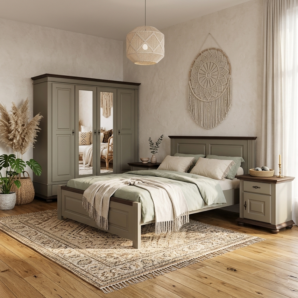 Descoperă Dormitorul SEVA 3 în nuanța calmă și reconfortantă Verde Salvie – un verde moale, inspirat din natură, care aduce prospețime, armonie și un aer boho-chic în dormitorul tău. Acest set complet din lemn masiv include pat matrimonial, dulap generos cu 4 uși (două cu oglindă) și două noptiere asortate. Perfect pentru cei care doresc un spațiu relaxant, fresh și conectat cu natura, fără să renunțe la eleganță și calitate superioară.