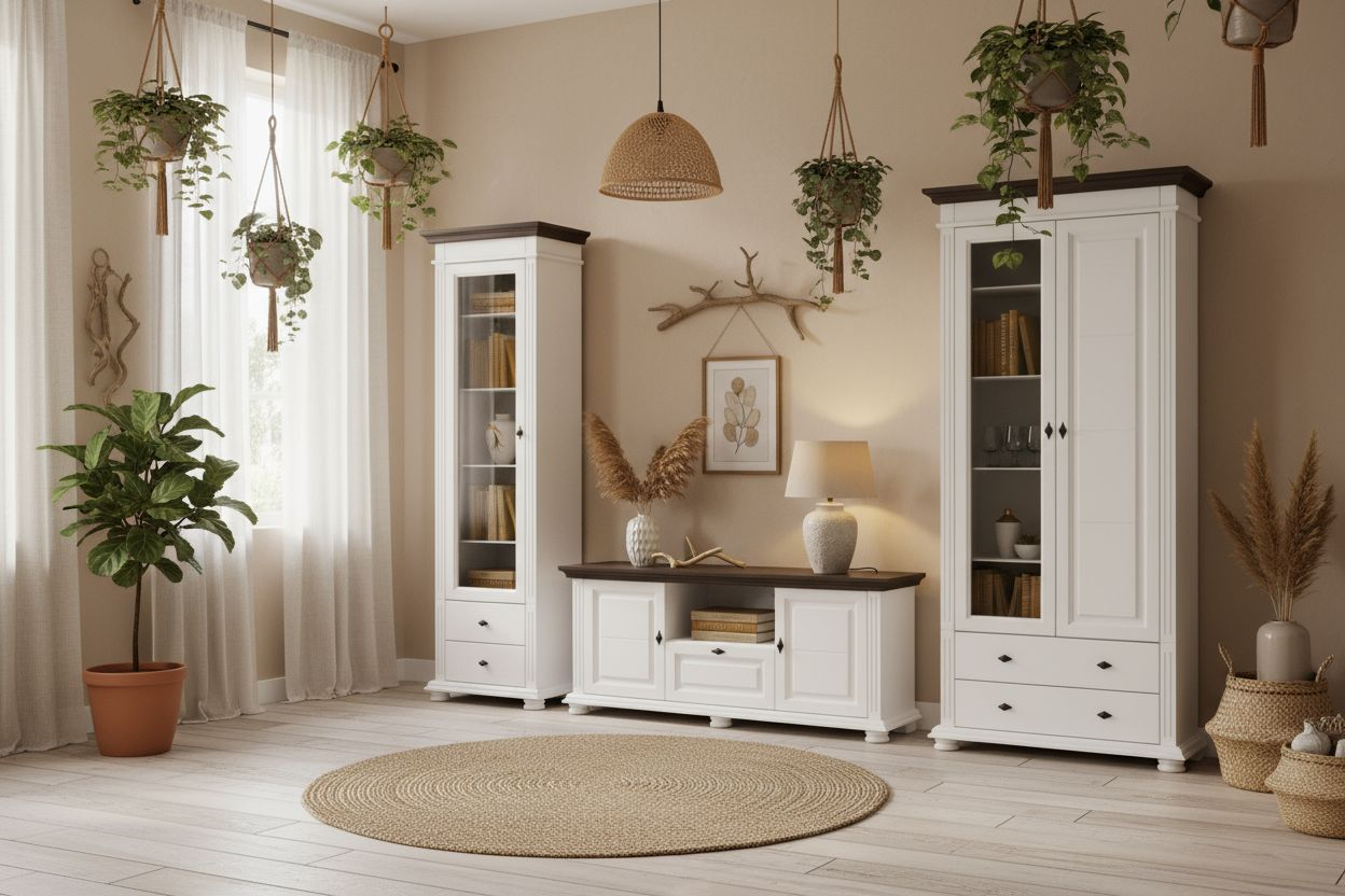 Transformă-ți livingul într-un spațiu elegant și luminos cu Setul de Mobilier Living Mara din lemn masiv, finisat impecabil în nuanța alb cald.