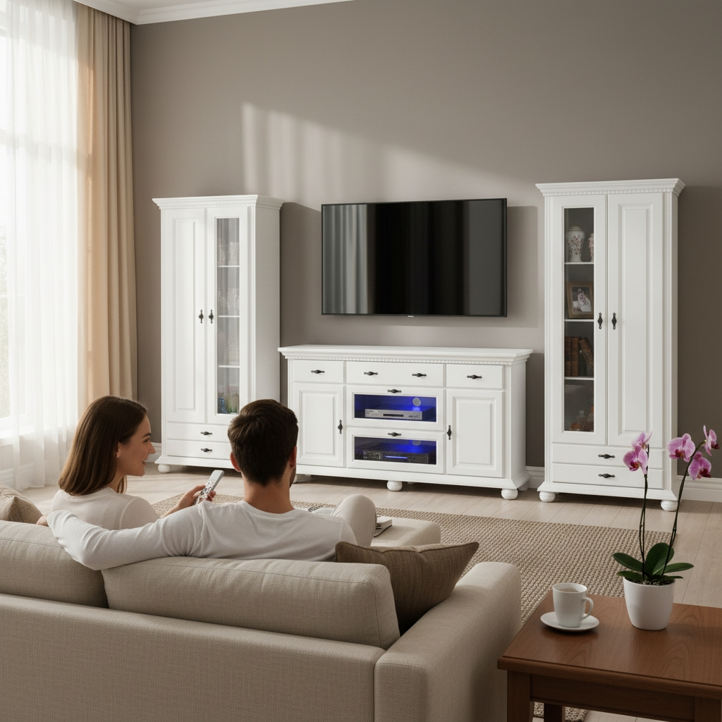 Livingul Bucov creează un centru de entertainment elegant și funcțional. Construit integral din lemn masiv alb, acest set de 3 piese transformă peretele TV într-un ansamblu coerent și luxos.