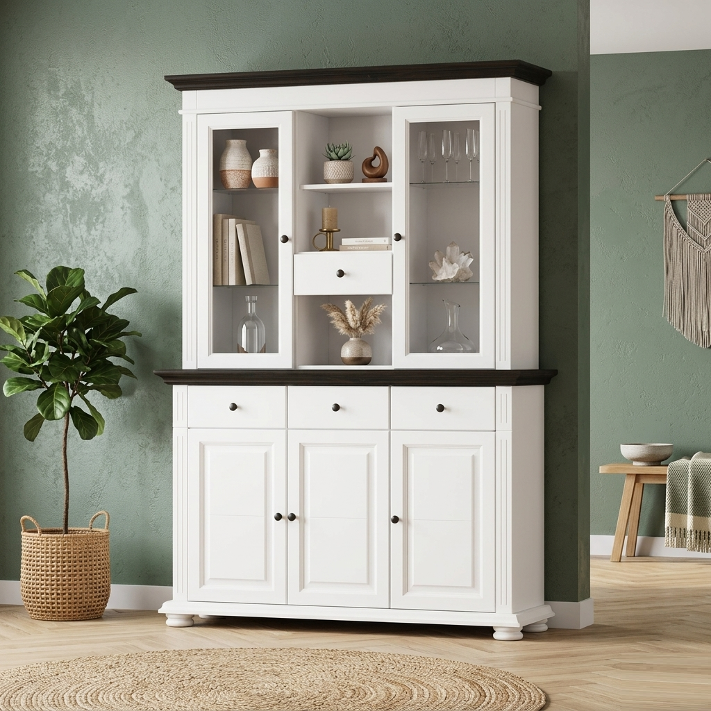 Designul cu 3 uși oferă acces facil și organizare optimă. Poți depozita veselă, cărți sau obiecte decorative, păstrând în același timp un aspect aerisit și ordonat. Spațiile vitrate sunt ideale pentru expunere, iar cele închise pentru depozitare discretă.